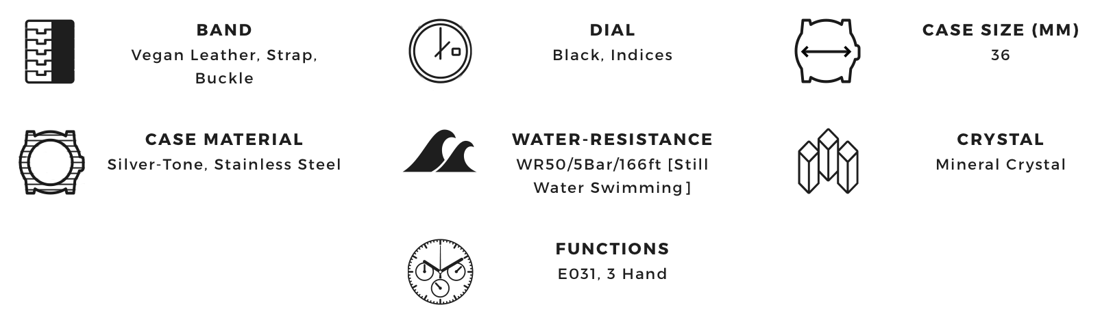 Enlightened by the active woman, the CITIZEN Modena was designed to fit her lifestyle from work to play and everything in between. A modern casual styling with Eco-Drive Technology, powering the watch for a lifetime by any light. Featured in a bold black vegan leather strap and stainless steel case with a rose-gold accented black dial. Caliber number E031.